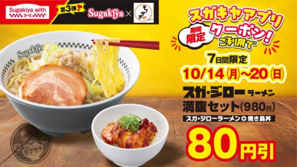 「Sugakiya with」第3弾として、愛知県岡崎市に店を構え、XやYouTubeでフォロワー数10万人を超える人気店「キブサチ」監修で、スガキヤ初の二郎系ラーメンが誕生しました!その名も「スガ・ジローラーメン」。さらにガッツリ食べたい方も満足の「炭火焼き 焼き鳥丼」も登場し、2024年10月10日(木)よりスガキヤ252店舗で期間限定で販売です。