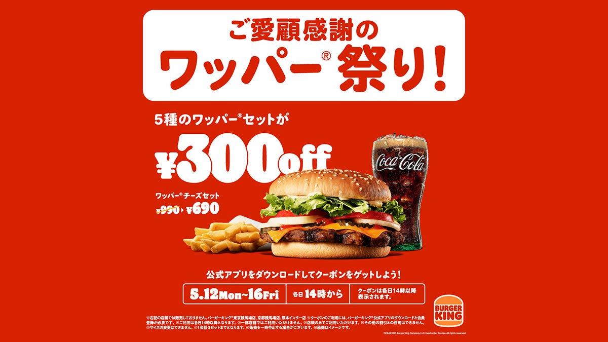 対象商品5種のワッパー® セットを通常価格より最大30%オフの300円引きでご提供するクーポンを、2025年5月12日(月)~5月16日(金)の5日間限定で各日14時からバーガーキング® 公式アプリにて配信。