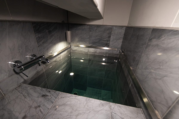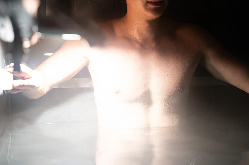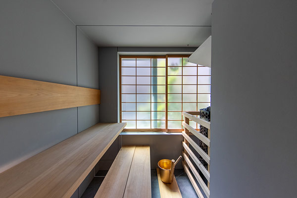 象徴的な要素が、国内屈指の深さを誇る水深約2メートルのアイスバス。全身を一気に包み込む“湖に飛び込むような”体験が、心地よい刺激とともにリトリート効果を高めてくれます。水温はチラー制御で常時15℃をキープ。ベンチや空間の仕上げには、奈良・吉野産の無塗装ヒノキを使用。削り出した木肌の香りが空間全体に広がり、まさに瞑想のためのサウナ空間が演出されています。