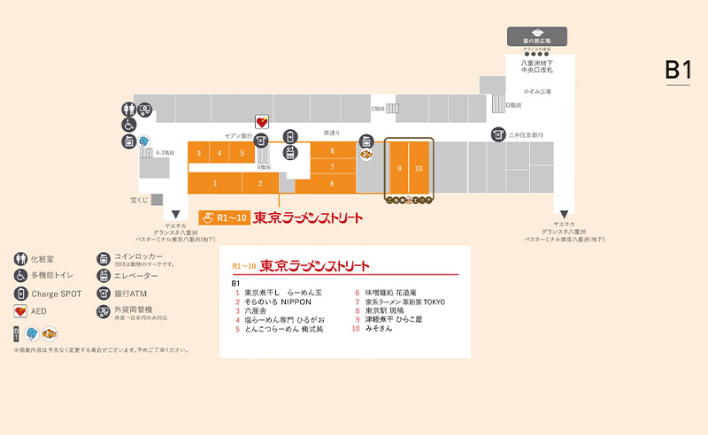店舗:「東京煮干し らーめん玉」「そらのいろ NIPPON」「塩らーめん専門 ひるがお」「とんこつらーめん 俺式 純」「六厘舎」「東京駅 斑鳩」「味噌麺処 花道庵」「家系ラーメン 革新家TOKYO」「津軽煮干 ひらこ屋」「みそきん」