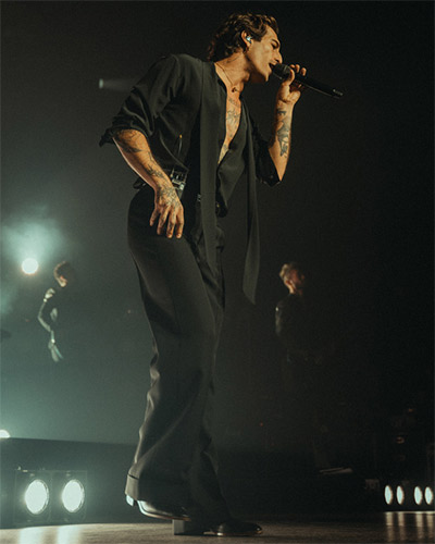 さらに9月27日のパリ公演では、ブラックのダブルブレストジャケットとグリーンドットのスカーフでエレガンスを纏い、バターカラーのシルクブラウスやライトブルーのポプリンシャツにフリンジ付きスカーフを合わせるなど、より遊び心を効かせたスタイリングを披露。どのルックも、彼の強烈なパフォーマンスと呼応するかのように観客の視線を奪った。