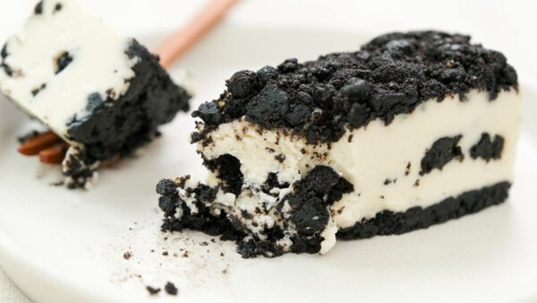 このスイーツの魅力は、なんといってもその食感の対比にあります。 なめらかでコク深いレアチーズケーキ。そこへ香ばしいブラックココアクッキーが、心地よいザクザクとした食感を加えます。