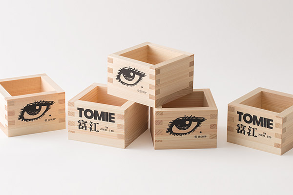・枡(ます) 『もろみ』からインスピレーションを得て、富江のイラストをシルクスクリーン印刷した、問題の「枡」。伝統的な酒器として、あのエピソードに思いを馳せながら日本酒を味わうもよし、小物入れとして日常に恐怖のアクセントを加えるもよし。