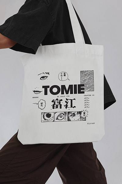 ・トートバッグ 『もろみ』のハイライトシーンを、あえてグラフィカルにコラージュ。A4ファイルも余裕で入るサイズ感で、デイリーユースに最適。通勤・通学のお供に、富江を。