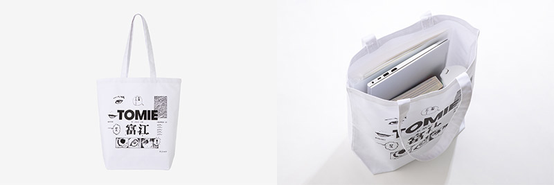 ・トートバッグ 『もろみ』のハイライトシーンを、あえてグラフィカルにコラージュ。A4ファイルも余裕で入るサイズ感で、デイリーユースに最適。通勤・通学のお供に、富江を。