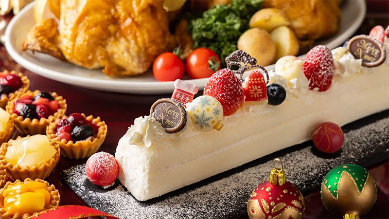 12月25日までの期間は、ブッフェラインがさらに華やかに。 「ローストチキン」や懐かしの「チューリップから揚げ」といったクリスマスの定番料理に加え、「ホワイト・ブッシュ・ド・ノエル」などの限定スイーツが登場します。