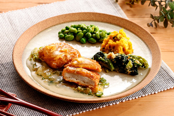 疲れた日の夜、無性に恋しくなるのは「出汁」の優しさではないでしょうか。 ロースカツをふんわりとした卵で包み込んだこの一品は、牡蠣醤油の旨みを効かせた特製出汁が味の決め手。カツのボリューム感がありながらも、口当たりはどこまでも柔らかく、ほっと一息つきたいランチや夕食に最適です。箸休めとなる副菜にも、和の心が宿ります。高野豆腐のそぼろを合わせた小松菜のおひたし、バターソースが香るかぼちゃ入りポテト、そして生姜あんを絡めた2種のお豆。主菜と副菜が織りなす穏やかなハーモニーが、心身のバランスを整えてくれるはずです。