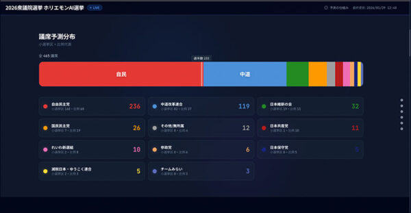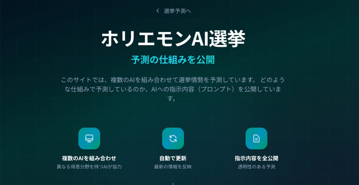 ホリエモンAI学校株式会社が公開した『ホリエモンAI選挙』は、2026年に予定されている衆議院議員総選挙に向けた予測プラットフォームです。このプロジェクトが画期的なのは、単に「誰が勝つか」を当てることではなく、予測に至るまでの思考プロセス、つまりAIへの指示内容(プロンプト)をすべて公開している点にあります。