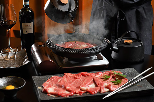 提供されるのは、料理長が選び抜いた食材の魅力を引き出した2種類のディナーコースです。 通年で楽しめる「厳選和牛コース」は、旨みが詰まった和牛を炭火焼や関西風すき焼き、リゾットなど、さまざまなアプローチで堪能できるお肉好きにはたまらない内容。目の前で仕上げられるすき焼きは、出来立ての香りが食欲をそそります。