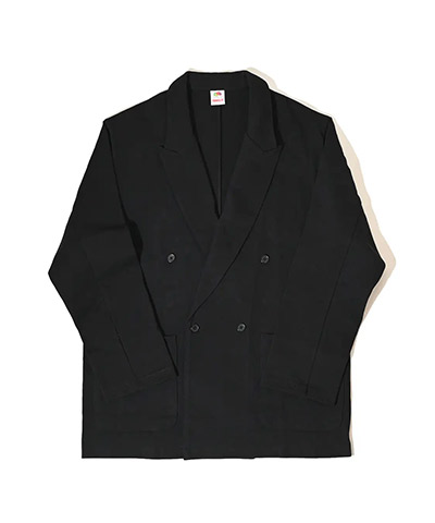 本作の最大の魅力は、その素材とデザインのギャップにあります。 使用されているのは、Fruit of the Loomの代名詞とも言える、タフな「12オンス・ヘビーウェイト天竺生地」。つまり、極厚のTシャツ素材です。 コットン100%の肌触りと伸縮性を持ちながら、見た目はピークドラペルのダブルブレスト・スーツ。