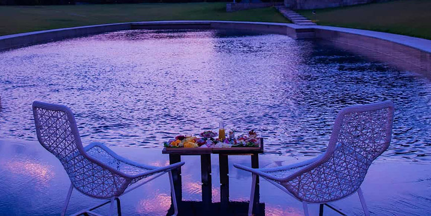 夏の朝焼けを眺めながらプールの浅瀬で楽しむ
